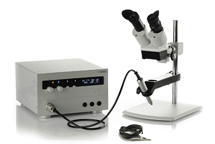 This set up includes a microscope base, a stem that holds replaceable electrodes, argon gas regulators, argon gas tank and base unit that produces a spot weld.